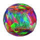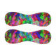 Stamped with colourful image of curved triangles or coloured ripples. In different vibrant colours, yellow, lime green, orange reddish, light blue, pink, lilac, red brownish or dark brown... with changes of tonalities that can cause the perception of curves or waves and some luminosity in some traces.