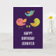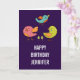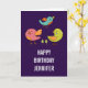 A birthday greeting card with a trio of cute and whimsical hand-drawn birds. 2 of the birds are standing together with some tiny green pine trees in between their feet. Another blue bird is flying up in the air between them. Set on a purple background.