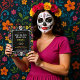 Against the black canvas, this invitation radiates warmth and joy, beckoning you to partake in an unforgettable occasion. At the top and bottom, two whimsical sugar skulls grace the design, while a delightful frame of doodle-style flowers envelops them, infusing the invitation with the spirit of remembrance and festivity.