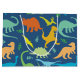 Colourful Dinosaur silhouette pattern. Tyrannosaurus Rex, titanosaurs, Triceratop, raptors, Ankylosaurs, Dino-Birds, Stegosaurus, Apatosaurus, Pteranodon and more in a colourful pattern in blue background, and dinosaurs in green, blue, yellow and orange.