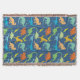 Dinosaur silhouette pattern. Tyrannosaurus Rex,  titanosaurs, Triceratop, raptors, Ankylosaurs, Dino-Birds,  Stegosaurus,  Apatosaurus, Pteranodon and more in a colourful pattern in blue background,  and dinosaurs in green, blue, yellow and orange.