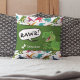 Does your little boy or girl love dinosaurs? This bedroom or nursery throw pillow is perfect! There's a big T-Rex saying RAWR, dinosaur footprints and your little kid's name on white, a green background, and a fun colourful dino pattern.