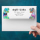 Fun colourful Dinosaur themed wedding return address envelope with funny dinosaur bride and groom and watercolor eucalyptus greenery to bring prehistoric Jurassic jungle joy to your wedding day. Modern whimsical typography calligraphy with easy to personalise templates. Unique colourful psychedelic T-Rex bride and groom in blue green pink purple yellow and orange hues with watercolor botanical foliage original artwork by artist Catherine Sweetman Ideal for the wedding day reception or rehearsal dinner. Matching wedding suite includes everything you will need on your fun wedding journey