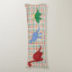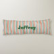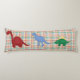 Colourful child's body pillow done in colourful red, blue, green, orange, and white, with plaid on the front and a striped pattern, on the backside. Cartoon style graphics of a red, a blue, and a green dinosaur decorate the plaid front of the pillow, with green bold custom text, on the back. Personalise the text to read what you want. Great gift idea for any little boy's room.