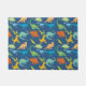 Colourful Dinosaur silhouette pattern. Tyrannosaurus Rex, titanosaurs, Triceratop, raptors, Ankylosaurs, Dino-Birds, Stegosaurus, Apatosaurus, Pteranodon and more in a colourful pattern in blue background, and dinosaurs in green, blue, yellow and orange.