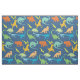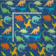 Colourful Dinosaur silhouette pattern. Tyrannosaurus Rex, titanosaurs, Triceratop, raptors, Ankylosaurs, Dino-Birds, Stegosaurus, Apatosaurus, Pteranodon and more in a colourful pattern in blue background, and dinosaurs in green, blue, yellow and orange.