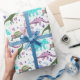 A charming and colourful dinosaur illustration for a birthday, graduation, or just because wrapping paper.