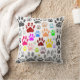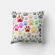 Decorative pillow with Images in many colours of cute dog paw prints all over.