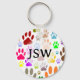 Images of dog paw prints all over. Colourful cartoon style design. Custom keychains for dog lovers. Edit initials to customise.