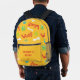 The design includes cute, colourful dog paw prints, white bones, and green tennis balls on a yellow background. The perfect backpack for your dog