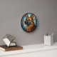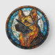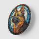 A stunning stained glass artwork depicting a lifelike dog portrait in vibrant colours, beautifully framed by intricate patterns of blue hues. This art conveys creativity, craftsmanship, and love for animals.