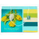 Colourful stripes in fresh, happy, vivid colours with a monogram and a Easter photo of yellow tulips and an Easter Egg with calligraphy script Happy Easter and cute short message.