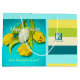 Dark and light blues with light cream, green and yellow colours happy design.
