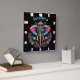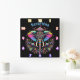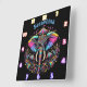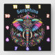 A beautifully decorated elephant stands majestically with colourful patterns and intricate designs, surrounded by playful motifs that evoke a sense of joy and celebration at a lively fair.