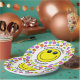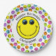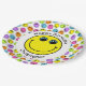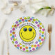 A yellow face sits in the centre of this plate with sample text "Happy Birthday" above and the name "Christopher" below for you to personalise. Background is a white circle with a border of colourful faces in pink, orange, yellow, green, blue and purple. Great for birthday parties or other special occasion.