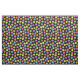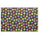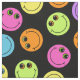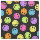 Orange, pink, purple, green, blue, and yellow faces on a black background cover this design.