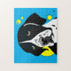 Dog lover jigsaw puzzles in flat colour of an English smooth coated pointer on a blue background and yellows circles. Background colour can be changed online