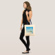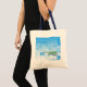 A fun and colourful custom tote bag that has an illustration of a green lizard standing on a paper filled with mathematical equations and geometric designs. Beautiful blue background.