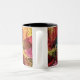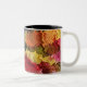 This colourful fine art mug features an image of a contemporary abstract fabric pattern in wavy psychedelic rainbow colours of pink, red, yellow, orange, green, blue, brown, mauve, purple and turquoise which resembles a painter's palette.