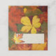 Rustic Fall wedding inspired folded place card with a photograph of colourful autumn leaves as the background. A rectangular text area, on the front of the card is decorated with a single yellow and orange leaf and is ready to personalise by hand, for your wedding reception.