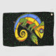 This golf towel is black with bright green dots and a colourful lizard in blue, yellow, orange, and green holding a twig with a leaf.