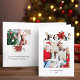 Bright, modern and clean holiday design featuring photo template, editable text fields and bold "Joy" text embellished with vibrant red and green poinsettias, berries and winter greenery.