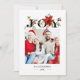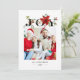 Bright, modern and clean holiday design featuring photo template, editable text fields and bold "Joy" text embellished with vibrant red and green poinsettias, berries and winter greenery.