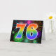 The front of this exciting, fun, and vibrant greeting card design features a colourful pattern inspired by celebratory fireworks, along with the number "76" featuring a multicolored rainbow like gradient pattern, on a black coloured background. The inside features a customised greeting message, or could perhaps be cleared and left blank if a message is to be written by hand instead. A greeting card like this might be a fun, happy way of sending a message to somebody who is celebrating their seventy sixth birthday, or perhaps to a couple celebrating their seventy sixth wedding anniversary, or to somebody celebrating some other 76th event. [~Z0000342]