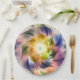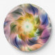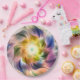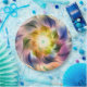 Colourful pinwheel of flaming fractals in cream, pink, blue, purple and gold on a zebra print background
