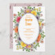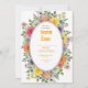 Beautiful wedding invitation template featuring a black oval frame surrounded by vibrant watercolor roses and wildflowers in pink, yellow, orange, purple, and blue on a white background – perfect for romantic botanical weddings.