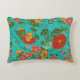 Colourful floral pattern with blue green background and orange-red and yellow flowers.