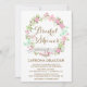 Whimsical and feminine invitation featuring floral wreath in pink, blush, green tea and mint green.