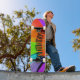 This skateboard has colourful flower petals on it.