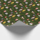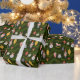 This cute, colourful wrapping paper features a pattern of folk-art Christmas ornaments hanging on pine branches. You'll find a nutcracker, star, a rocking horse, glass balls, bells, and more! Great for kids and for kids at heart!