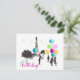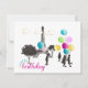 Artistic Birthday design featuring the Eiffel tower silhouette with french macaron clouds and silhouettes of kids playing with colourful French macaron balloons.