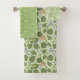 Cute pattern showing colourful frogs sitting in trees on leaves with flowers and organic shapes + coordinate pattern designs for a jungle feel in your bathroom!