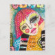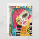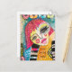 This colourful mixed media original art piece features a whimsical girl with bright pink hair on a colourful abstract background of dusty blue and tangerine orange with pink, yellow, and green half circle shapes and black and white stripes and an assortment of doodles. The blank postcard has customisable "just a little hello" text on the front and plenty of room for your hand written message inside, or add your text in the design tool. It is perfect for birthdays, thank you cards, missing you, get well, and any other upbeat occasion!