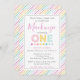 Pastel-coloured rainbow stripes set the background for this fun first birthday invitation. Modern sans serif fonts are easy to personalise for your little one's big day!