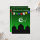 Colourful illustration with a festive garland in a magic night scene with a mosque silhouette and the moon and stars on a green night sky.