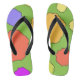 These colourful flip flops will brighten your summer! They are full of geometric funky shaped orange, yellow and blue circles on a green background.