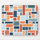 Abstract Mid Century style design with orange, red, blue, light blue, turquoise, mustard colour and navy blue square and rectangle shapes decoration on white background
