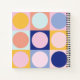 A sweet, playful geometric pattern of circle and square shapes in a cute colour palette of blue, yellow, coral, periwinkle, and pink.
