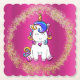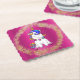 An adorable pink unicorn paper coaster, perfect for the kids' unicorn party, as party favours and/or table decorations. The design has a colourful, sweet little baby cartoon unicorn in sitting in a ring of golden glowing glitter (please note, the glitter is printed).