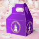 A purple unicon favour box with baby unicorns inside large circles of golden glitter, on a purple background. This unicorn gift box would be ideal for any unicorn party or celebration.