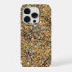 Glamourous golden glitter phone case with colourful glassy pieces sprinkled over black background.