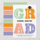 Colourful GRAD typography Class of 2026 graduation invitation. It features the word "GRAD" in colourful bold typography with the party details in the letters. The back includes a striped pattern with colourful stripes.