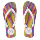 Adult flip flops with white straps featuring abstract, colourful rainbow gradient (in bright yellow, orange, red, purple, blue and green shades) with a monogram in matching pink shade on a white round frame.