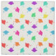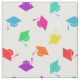 Fun graduation fabric with a pattern of colourful graduation caps against a white background.