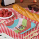 A groovy retro Christmas paper plate featuring a fun and festive design that says, "'Tis the Season" and features a bright and groovy disco ball.