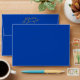 A retro modern hand written bright colourful wedding envelope. Which features bold bride and groom's names in yellow with blue background. And personalised return address a. Which suits the whole wedding suite.